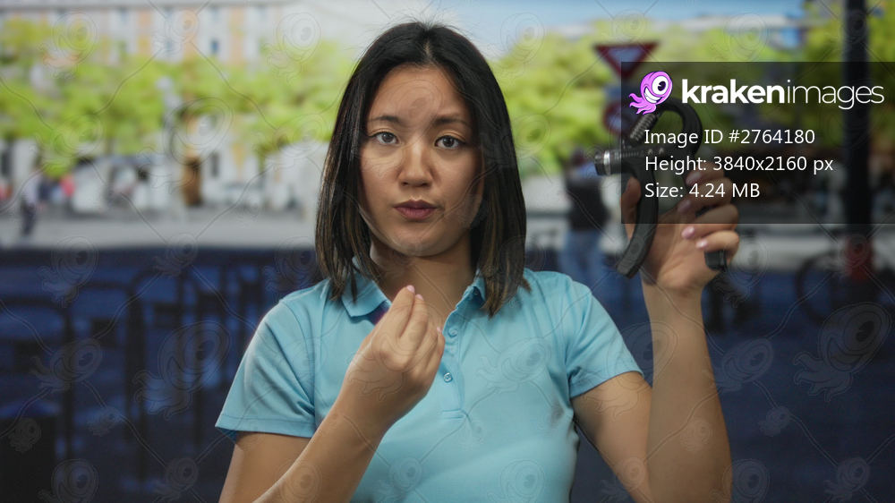 Woman in blue shirt demonstrating hand grip strengthener outdoors on city street conveying fitness concept with focus on urban exercise.