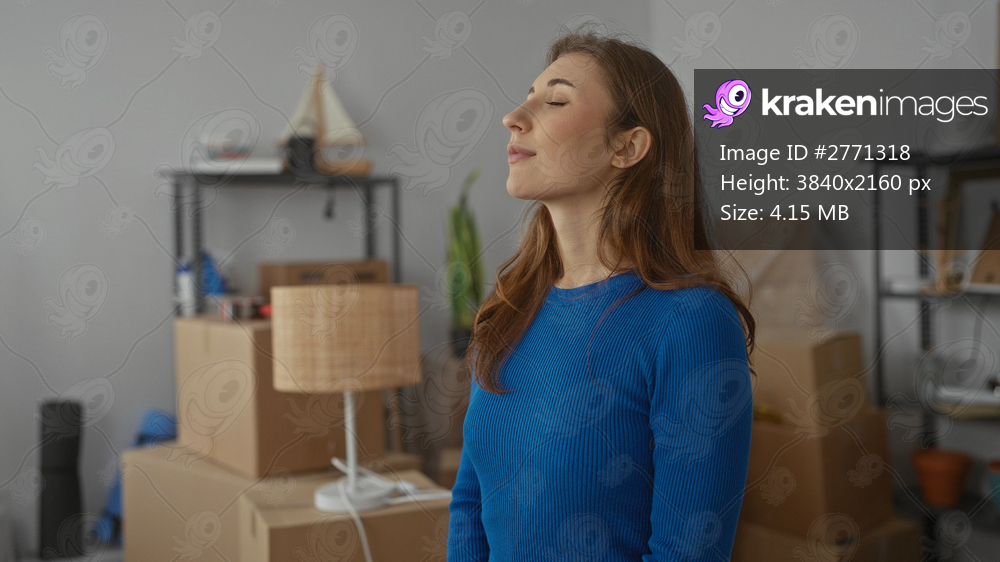Woman in blue shirt enjoying calm in new home living room surrounded by moving boxes and modern decor