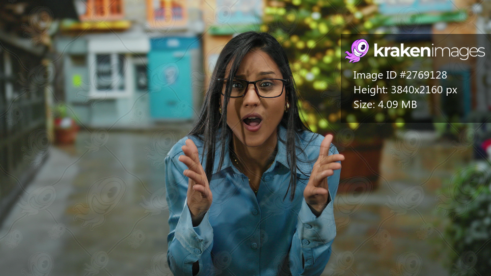 Woman in blue shirt gesturing excitedly outdoors on a vibrant city street during festive season.