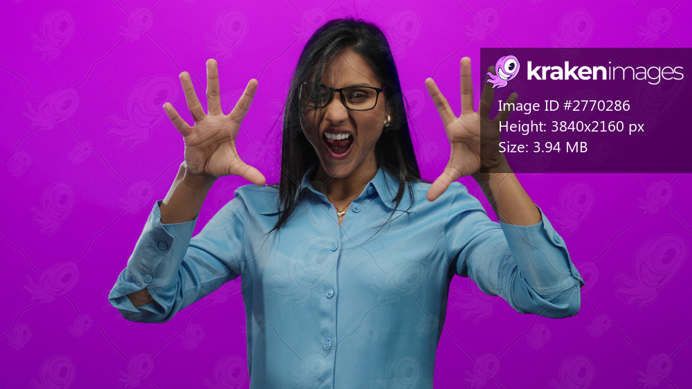 Woman in blue shirt gesturing with excitement against a vibrant pink background, conveying energy and enthusiasm with fists raised and a joyful expression. - Kraken Images