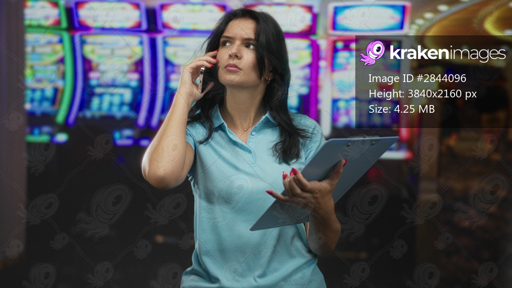 Woman in blue shirt holding phone to ear and pointing at clipboard in building with slot machines behind her; calm concentration.