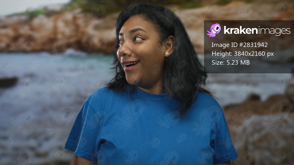 Woman in blue shirt shows bare arms and smiles while turning head toward camera in studio; joy optimism.