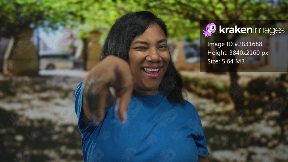 Woman in blue shirt smiling broadly and pointing finger among green trees in park; friendly invitation.