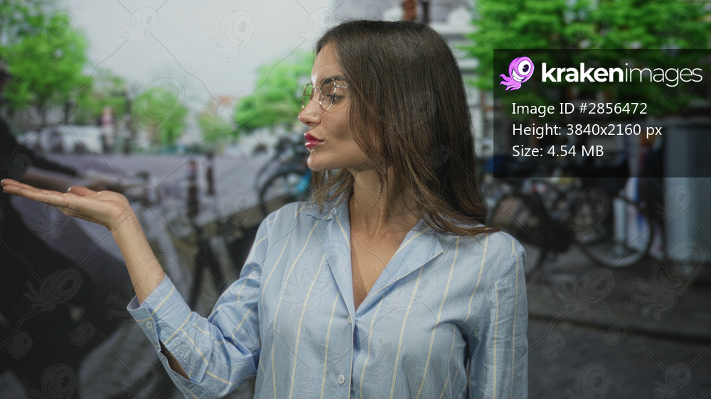 Woman in blue shirt wearing glasses extends hand with open palm on street lined with bicycles; bold confidence.