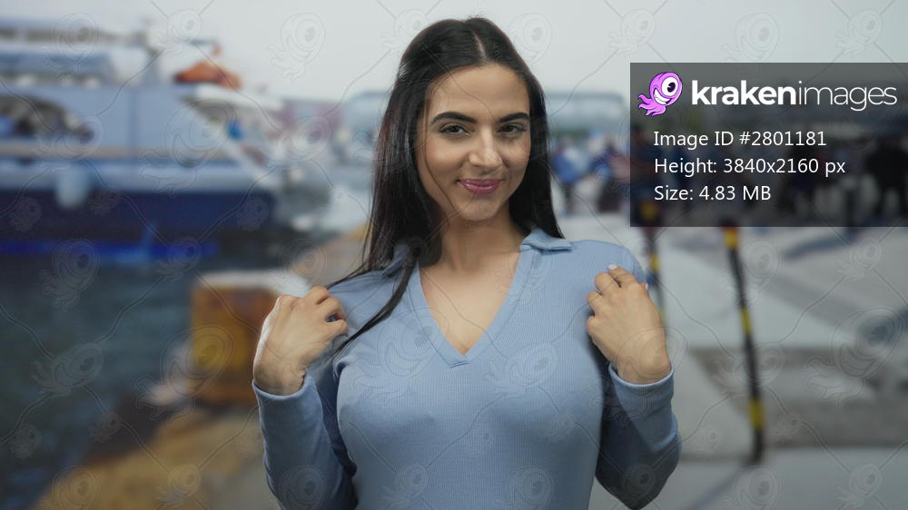 Woman in blue smiling at a busy port with boats in the background on a sunny day.
