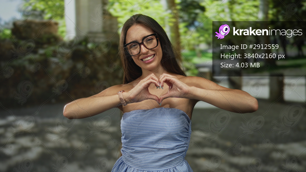 Woman in blue strapless dress wearing glasses forms heart with hands in forest, smiling at camera with playful expression; affection.