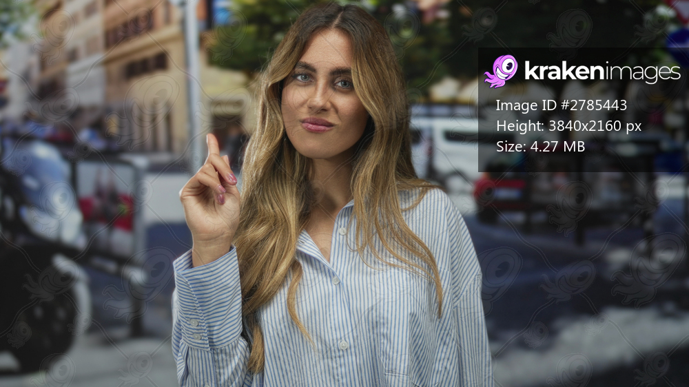 Woman in blue striped shirt points index finger forward amid bustling city street intersection; confidence focus.