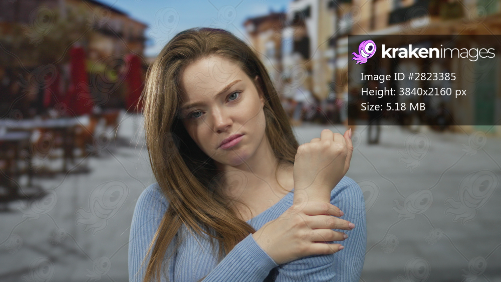 Woman in blue sweater frowning holds wrist on busy sunlit street cafe terrace with outdoor tables; discomfort.