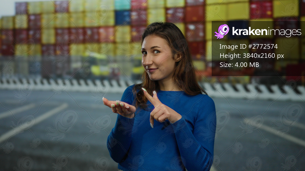 Woman in blue sweater gestures in port with containers stacked in background suggesting new opportunity or presentation outdoors.