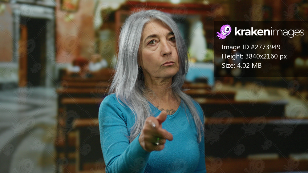 Woman in blue sweater with grey hair stands inside church surrounded by pews creating a serene spiritual atmosphere with focus on maturity wisdom and quiet contemplation. - Kraken Images