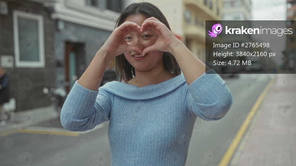 Woman in blue sweater making a heart shape with hands smiles on a city street showcasing joy and connection in an urban outdoor setting.