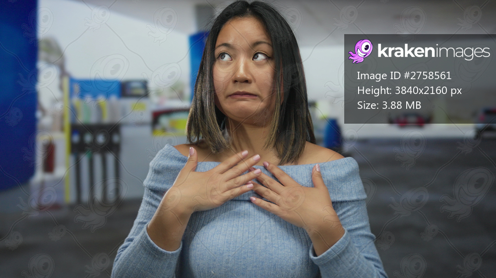 Woman in blue sweater showing uncertain expression at outdoor petrol station with blurred cars background, illustrating confusion or decision making.