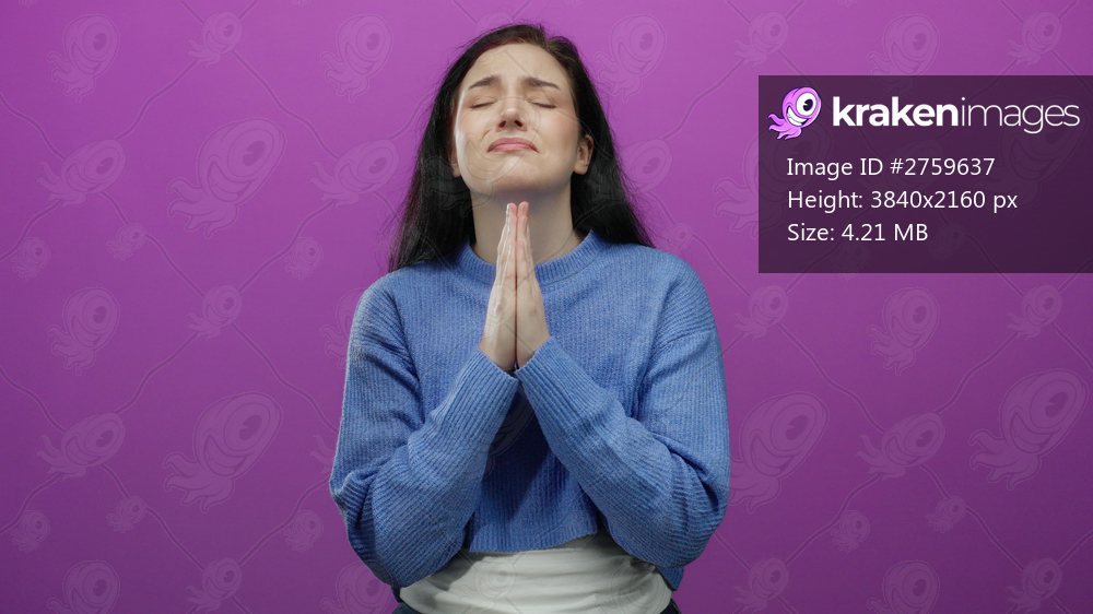 Woman in blue sweater showing various emotions on pink background conveying diverse feelings like fear and hope in a studio setting.