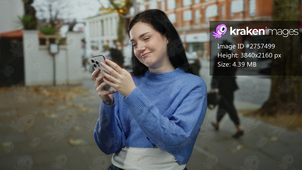 Woman in blue sweater smiling while using smartphone on busy street in urban autumn setting.
