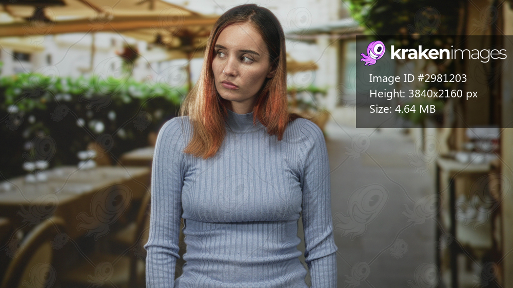 Woman in blue sweater standing with arms at sides, glancing sideways with a slight frown on a street cafe walkway; melancholy.