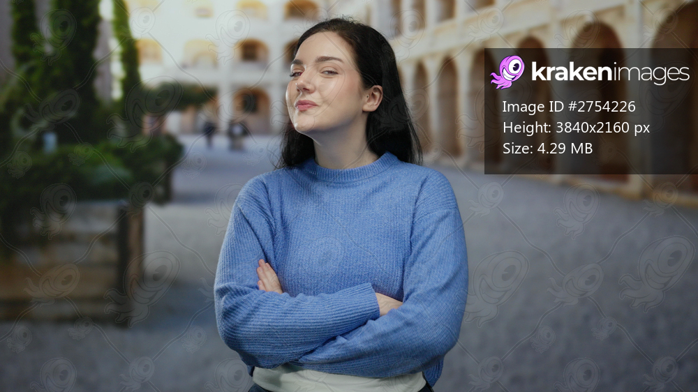 Woman in blue sweater stands confidently on university campus making idea gesture with historic building background.