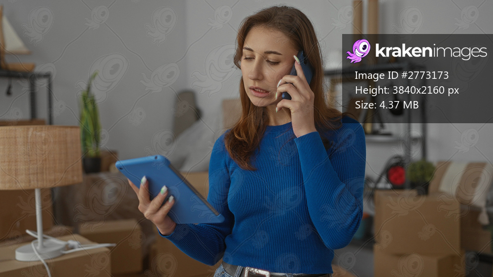 Woman in blue sweater talks on cellphone while holding tablet surrounded by moving boxes indicating new home in modern living room setting.