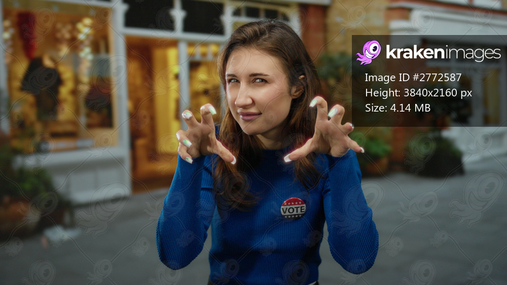 Woman in blue sweater with vote badge poses playfully on city street with blurred background of shops and plants in outdoor urban setting.