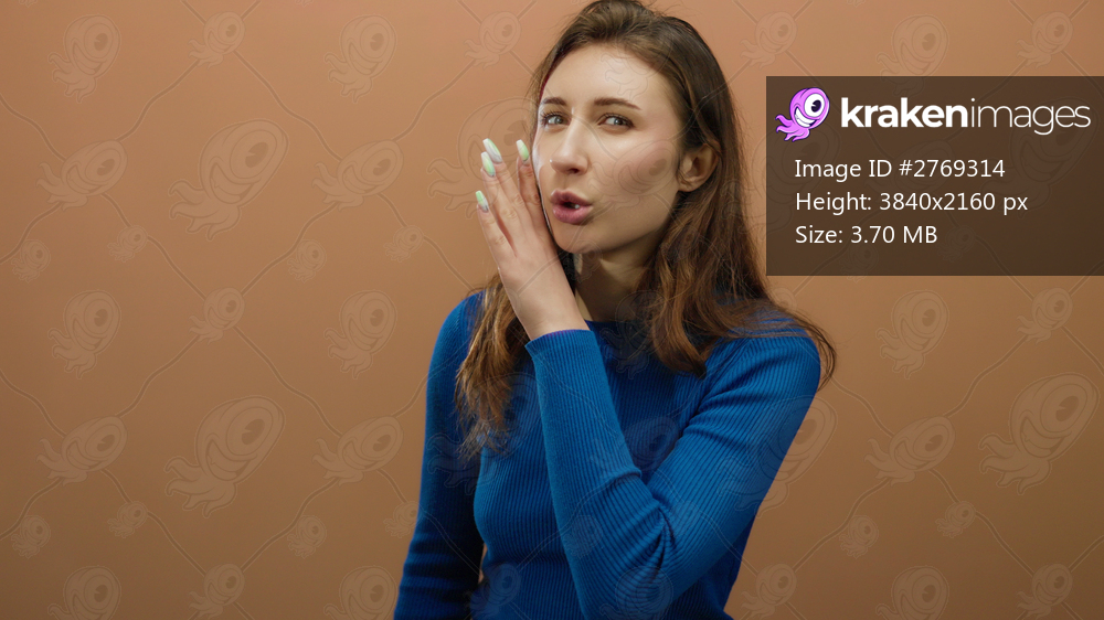 Woman in blue sweater whispers against a brown background, conveying a secretive gesture with expressive eyes and soft lighting.