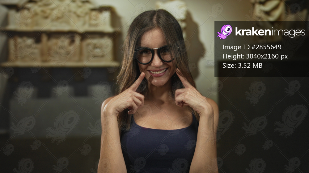 Woman in blue tank top wearing glasses standing and smiling as she points finger to smile in building gallery; playful joy confidence warmth.