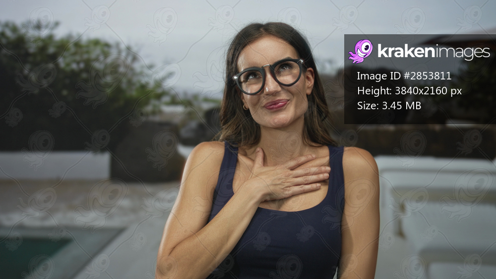 Woman in blue top with glasses standing with hand on chest on balcony of white building under cloudy sky; gratitude.
