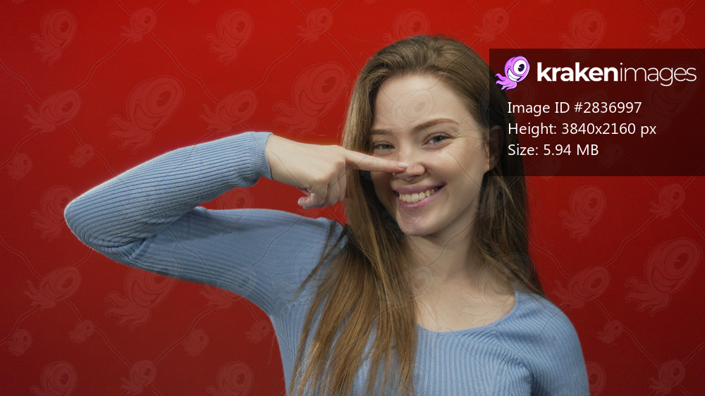 Woman in blue top pointing finger to nose in red studio with long hair and subtle smile; playful confidence.