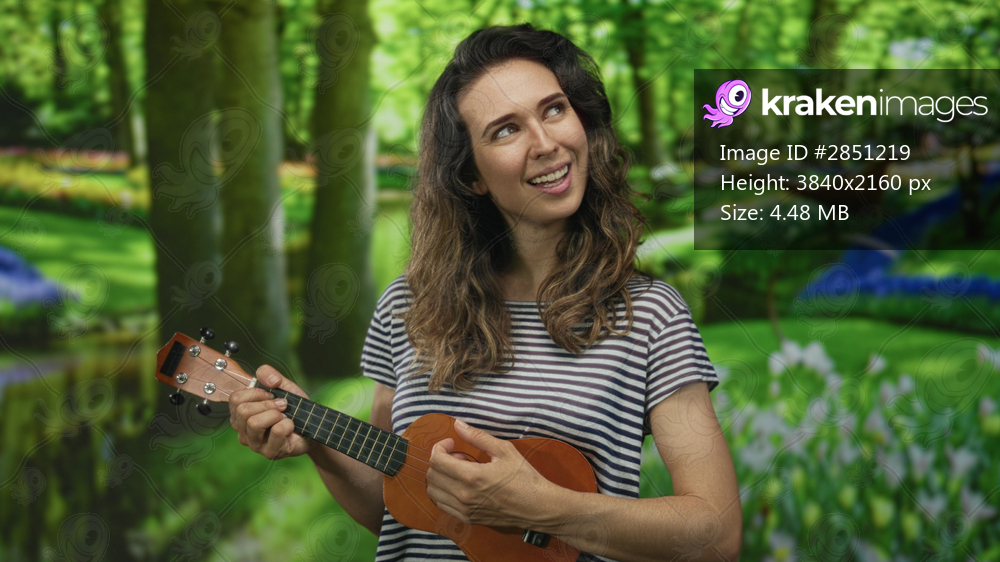 Woman in blue and white striped shirt strums ukulele and smiles among sunlit trees in forest; serenity.