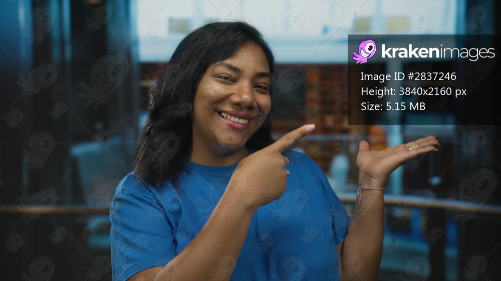 Woman in bright blue shirt smiles while pointing finger at open palm display in sleek hotel lobby; joy.