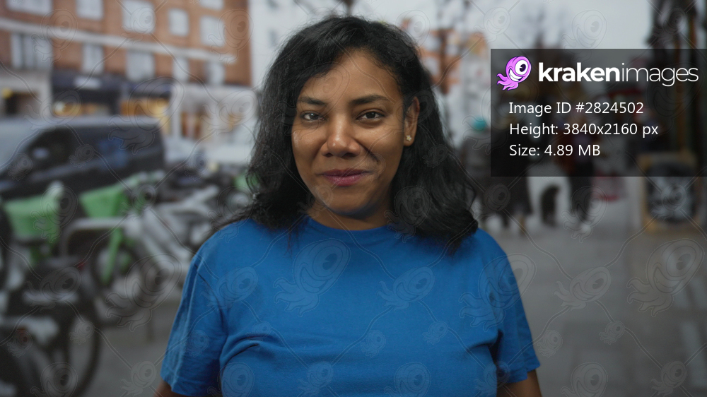 Woman in bright blue shirt smiling with hands visible by bicycle rack on busy urban city street in daylight; confidence.