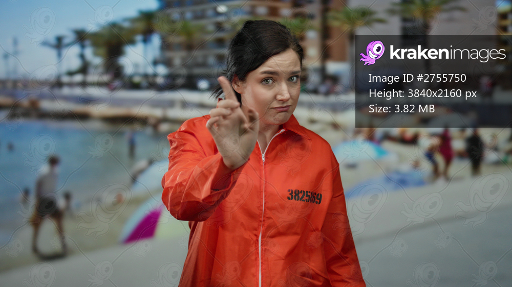 Woman in bright orange prison jumpsuit at the beach, waving with a playful expression under sunny skies.