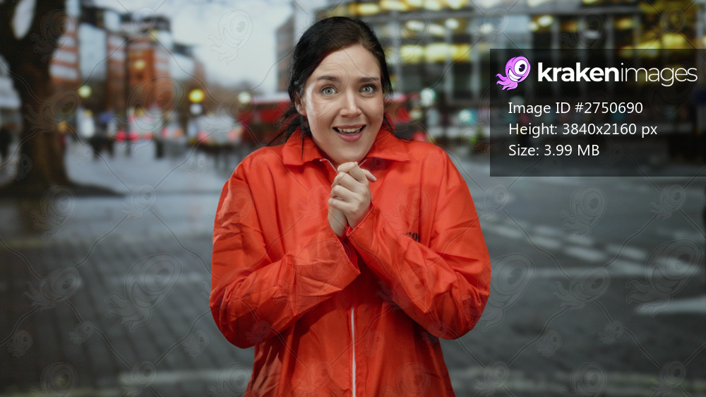Woman in bright orange prison jumpsuit stands on busy urban street, expressing emotion outdoors with blurred city background in early evening light.