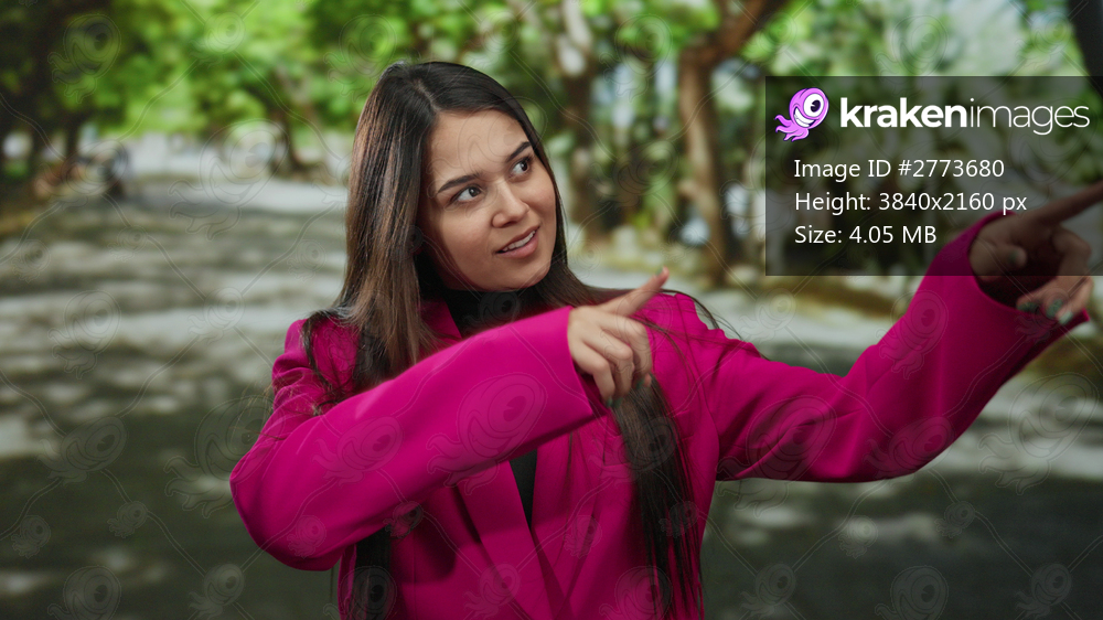 Woman in bright pink jacket points joyfully in a serene park setting surrounded by greenery and sunlight