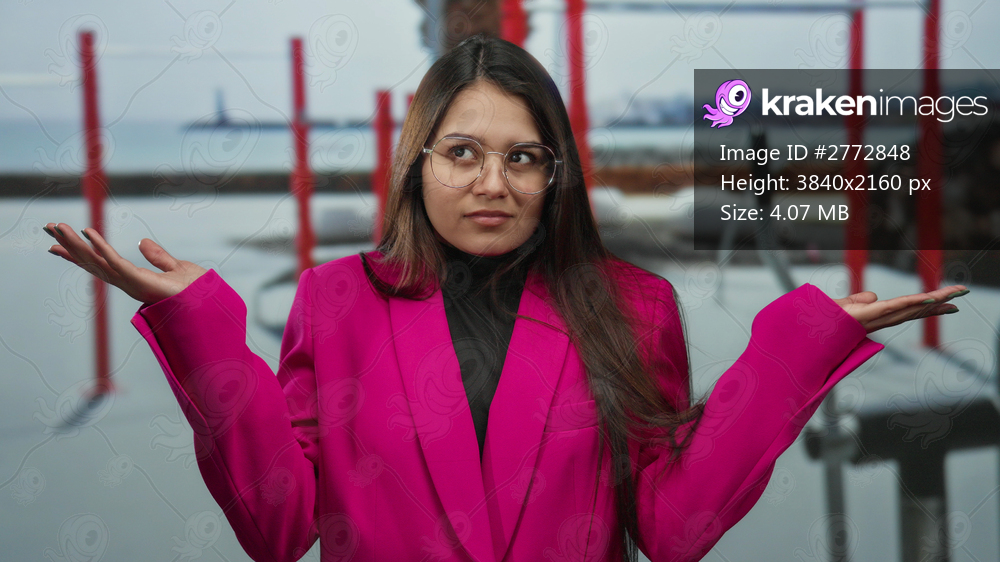 Woman in bright pink jacket stands in an outdoor gym with a confused expression, surrounded by exercise equipment and scenic ocean view.