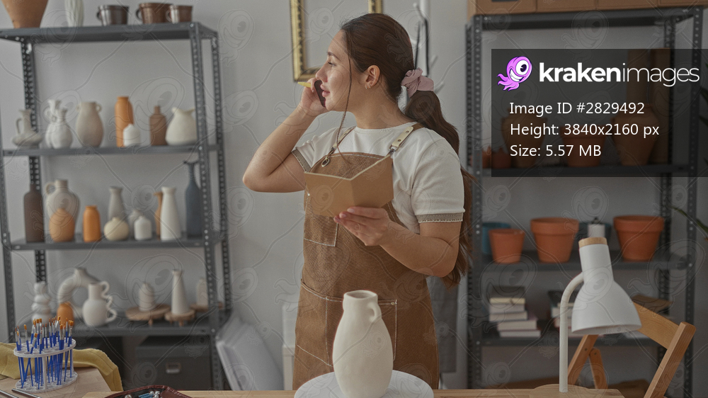 Woman in brown apron holds smartphone to ear and reads notebook in artisan workshop; planning focus.