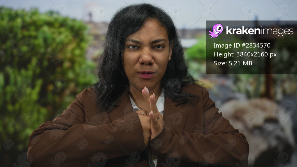 Woman in brown blazer with serious expression making aggressive gesture by hitting palm with fist in forest; anger.