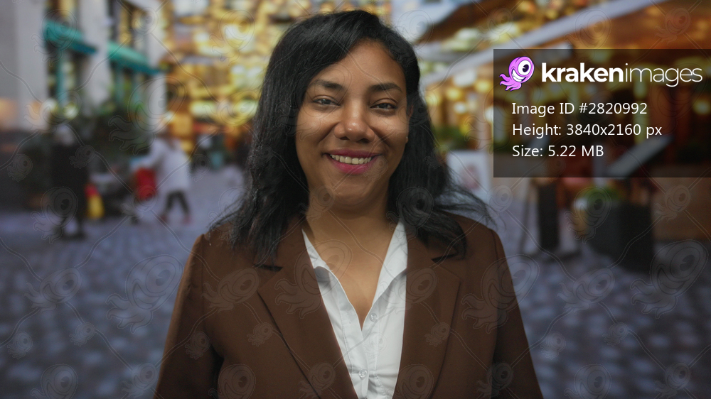 Woman in brown blazer and white shirt with bare face smiling under city lights on cobblestone street; optimism.