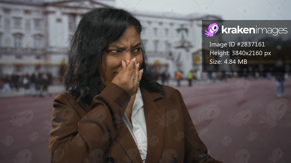 Woman in brown blazer and white shirt covers mouth and pinches nose outside historic landmark building; disgust.