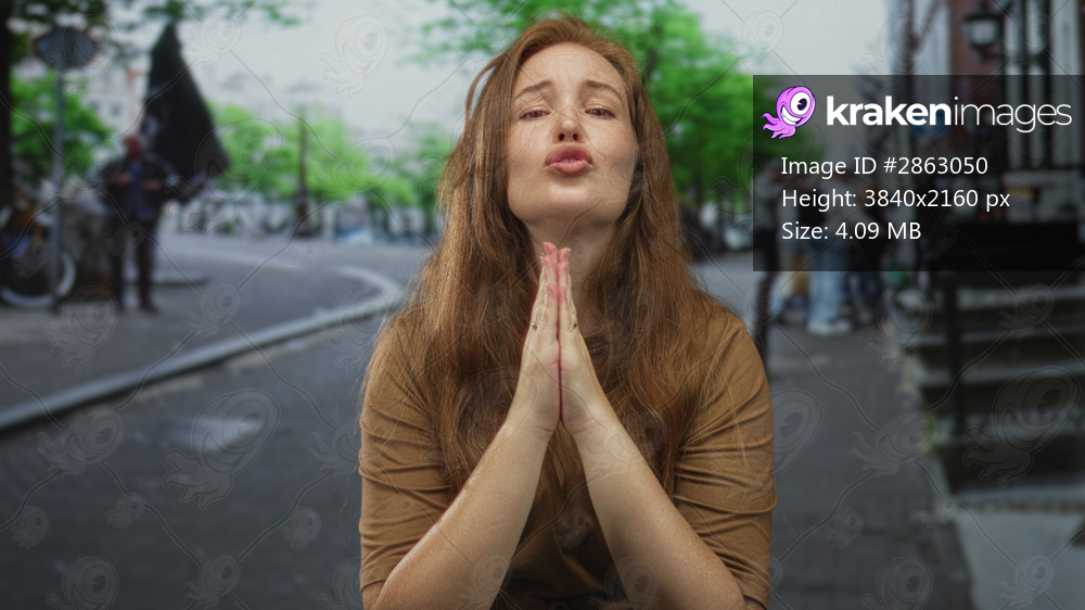 Woman in brown dress with hands pressed in prayer gesture on city street amid blurred pedestrians; prayer hope.
