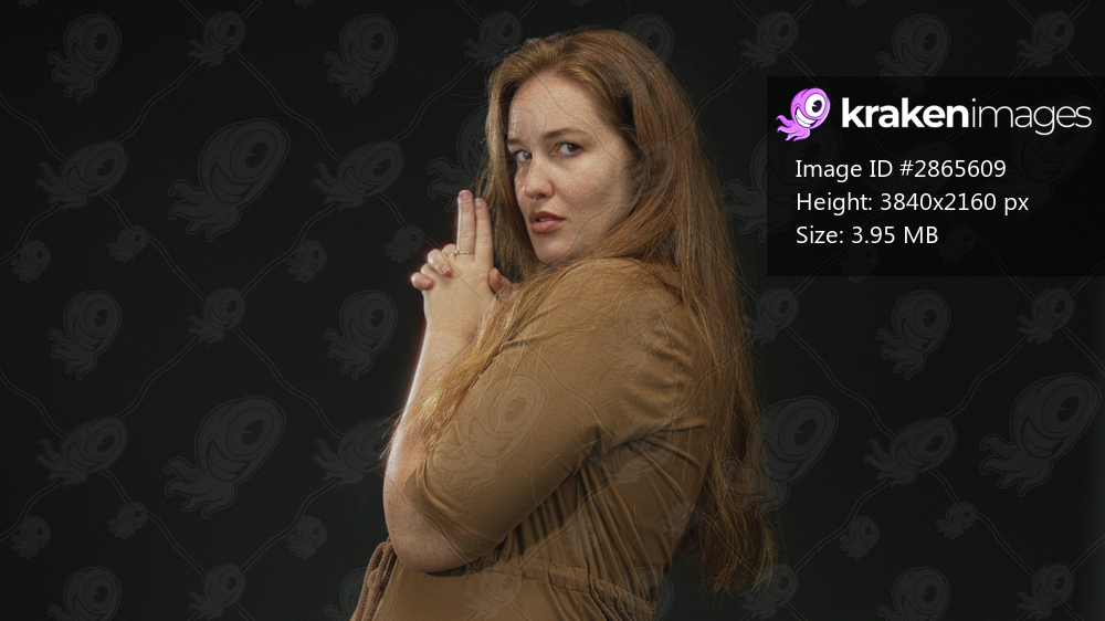 Woman in brown dress points fingers in a black studio setting with serious gaze and focused expression; confidence.