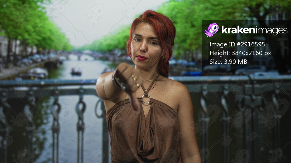 Woman in brown dress shows thumbs down with extended hand on a street bridge over a canal in amsterdam; defiance protest.