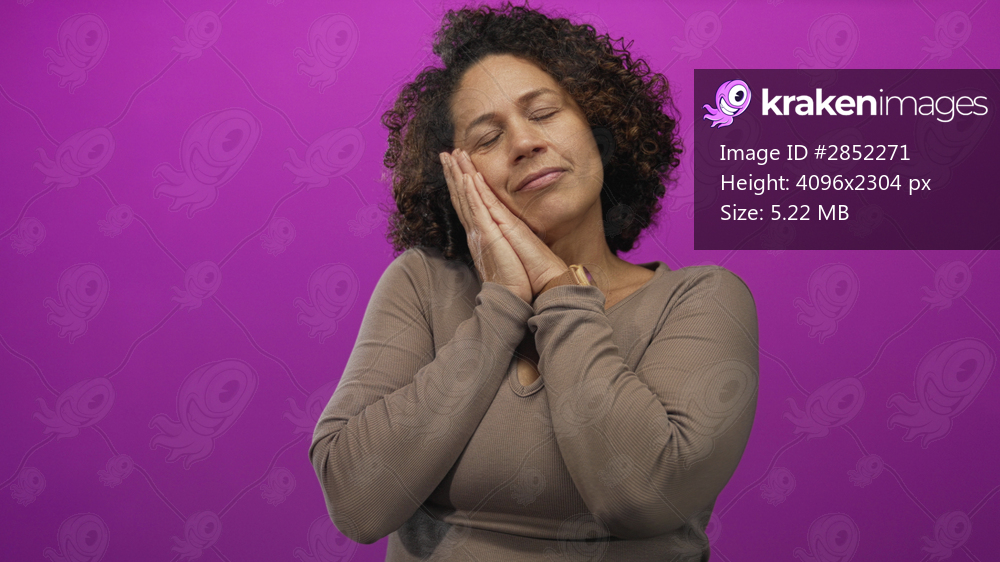 Woman in brown longsleeve shirt pressing hands to cheek for a restful sleep in vibrant purple studio lighting; serenity.