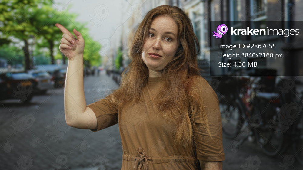 Woman in brown shirt points finger to building on a bustling urban street; clarity confidence vision.