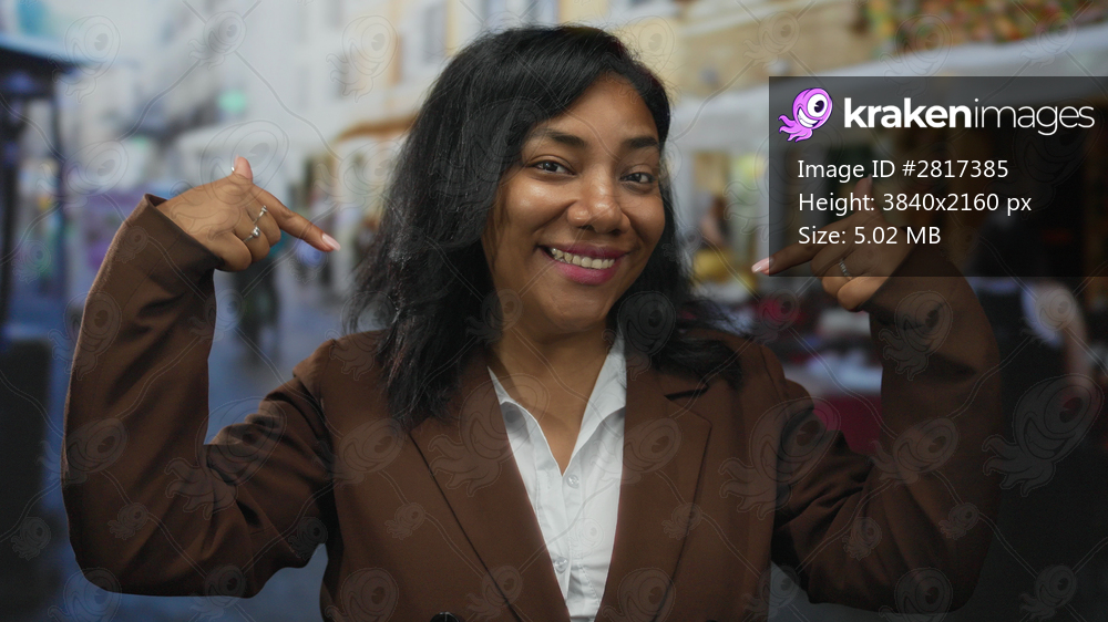Woman in brown suit jacket and white shirt points finger to self on busy city street; confidence pride empowerment.