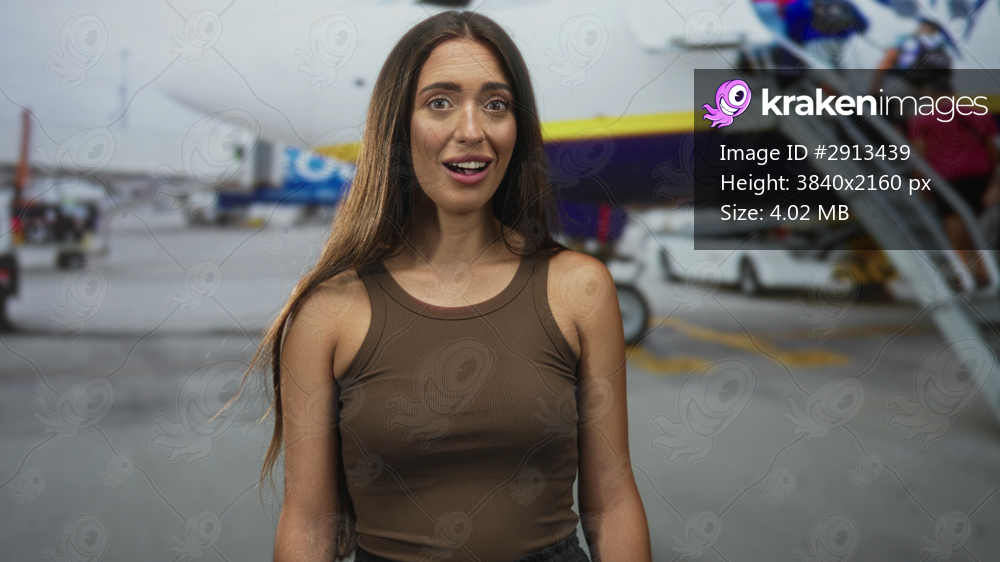 Woman in brown tank top with exposed shoulders and open mouth looking toward jet bridge and aircraft stairs at airport terminal, candid profile; travel curiosity. - Kraken Images