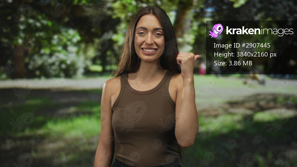 Woman in brown tank top pointing her thumb over shoulder while smiling in a sunlit forest; playful leisure.