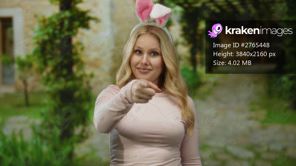 Woman in bunny ears gesturing humorously in a mediterranean stone house, surrounded by lush greenery, conveying a playful and cheerful atmosphere.