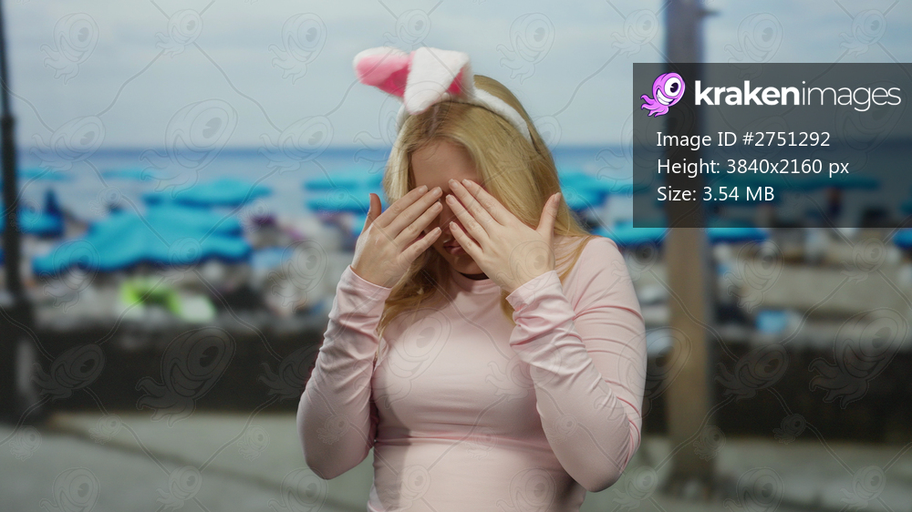 Woman in bunny ears looking surprised on a sunny beach promenade with loungers in the background, radiating humor and playful emotions.