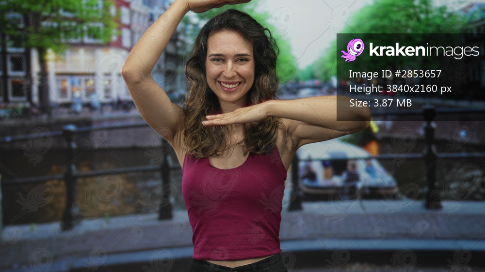 Woman in burgundy tank top waves bare arms on street by amsterdam canal water under daylight; happiness.