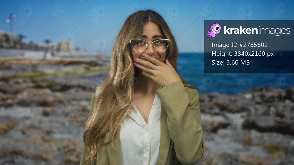 Woman in business jacket and glasses covering mouth with hand on sunny rocky coastline by blue sea; surprise curiosity.