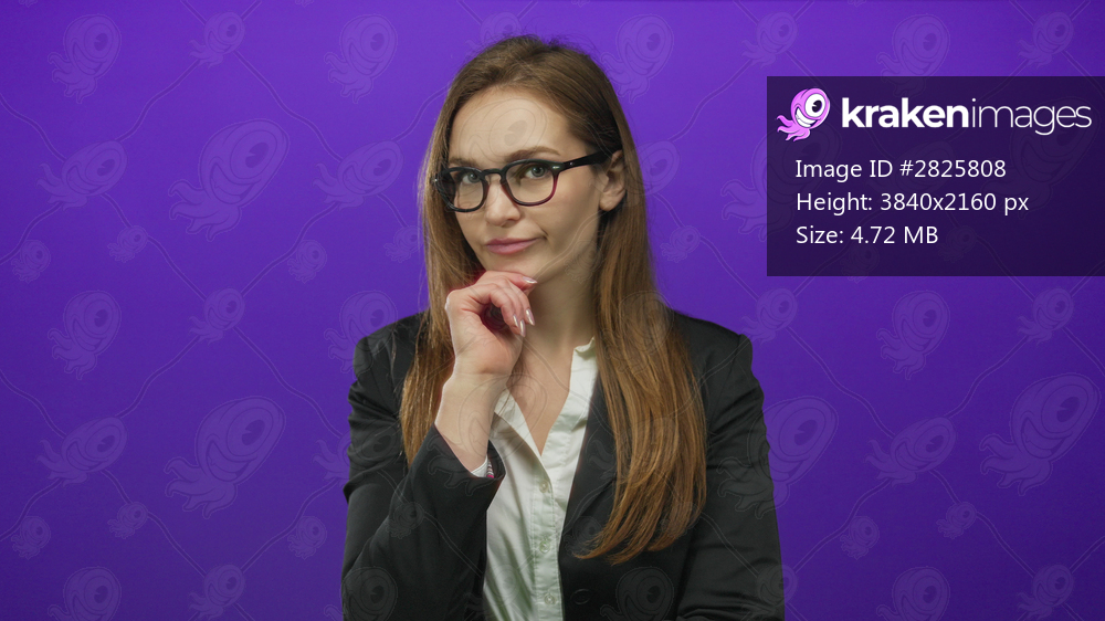 Woman in business suit with glasses and long hair rests hand on chin in purple studio; thoughtfulness.